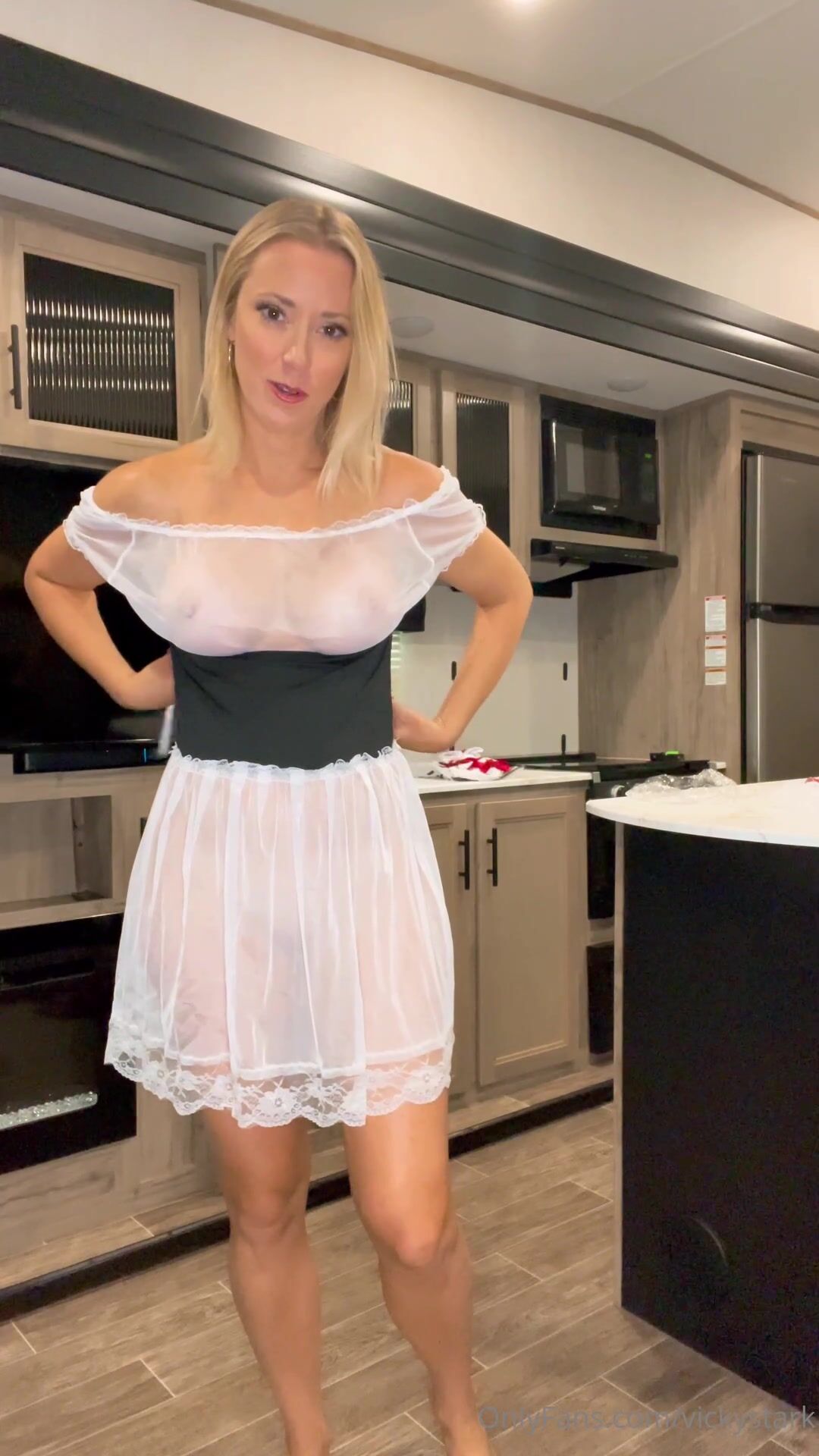 Vicky Stark tryon her seethrough maid dresses in kitchen and spreading booty to show pussy onlyfans video